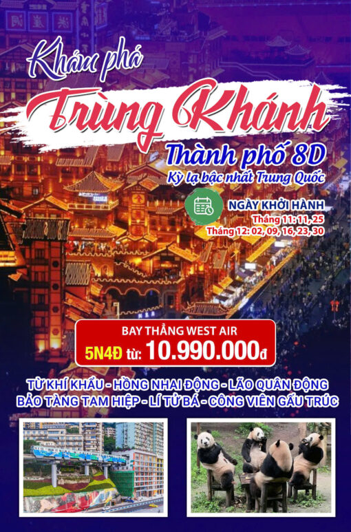 HĐV và đoàn làm thủ tục xuất cảnh, sau đó đáp chuyến bay PN6424 lúc 21h05-00h15 (Hà Nội – Trùng Khánh). Đến Trùng Khánh, đoàn làm thủ tục nhập cảnh. Xe và HDV đưa đoàn về khách sạn nhận phòng và nghỉ ngơi.