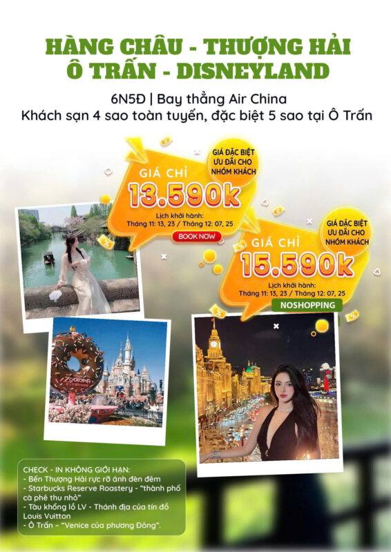 Bạn đã từng mơ về một chuyến đi đậm chất thơ nơi dòng nước lững lờ trôi qua những ngôi nhà cổ kính, hay được lạc bước giữa thế giới hiện đại rực rỡ ánh đèn của Thượng Hải? Hãy để Bluetour mang bạn đến với hành trình 6 ngày 5 đêm đầy cảm xúc: Hàng Châu – Thượng Hải – Ô Trấn – Disneyland, bay thẳng cùng Air China, nghỉ dưỡng khách sạn 4 sao toàn tuyến, đặc biệt 1 đêm tại khách sạn 5 sao giữa lòng cổ trấn Ô Trấn.