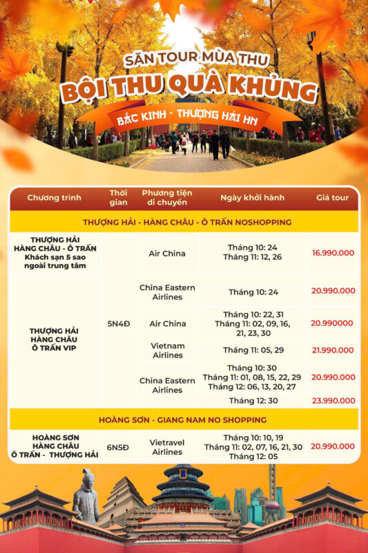 • Ưu đãi hấp dẫn: mức giá cực tốt trong mùa thu – thời điểm đẹp nhất trong năm để du lịch Trung Quốc.