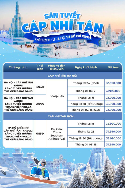 Bạn đang mơ về một mùa đông kỳ diệu với tuyết trắng xóa, những lâu đài băng lấp lánh và hoạt động trượt tuyết đầy phấn khích? Đừng bỏ lỡ chương trình săn tuyết Cáp Nhĩ Tân do Bluetour tổ chức – hành trình đưa bạn từ Hà Nội hoặc TP. Hồ Chí Minh thẳng đến những điểm đến băng tuyết nổi tiếng nhất Trung Quốc! Với lịch khởi hành linh hoạt vào dịp Noel và Tết Dương lịch, đây là cơ hội hoàn hảo để bạn và gia đình tận hưởng kỳ nghỉ đông đáng nhớ.